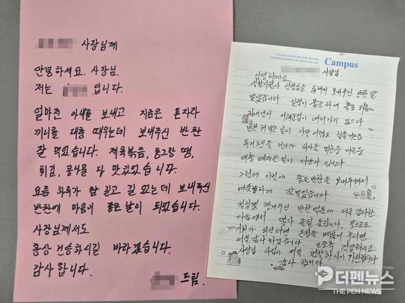반찬을 전달받은 이웃들이 직접 쓴 감사 편지가 행정복지센터로 이어지며 나눔의 효과를 체감하게 하고 있다.