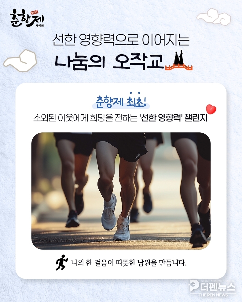 남원시 관계자는 “이번 챌린지는 경쟁이 아닌 나눔의 가치를 공유하는 데 의미가 있다”며 “춘향제가 지닌 사랑의 정신이 전국으로 확산되는 계기가 되길 기대한다”고 말했다.