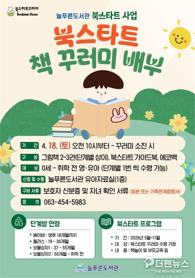 군산시 늘푸른도서관은 오는 18일부터 북스타트 책꾸러미 배부를 시작으로 영·유아 대상 독서문화 프로그램을 본격 운영한다. 이 사업은 생애 초기부터 책과 친숙해질 수 있도록 돕는 대표적인 독서 지원 정책이다.