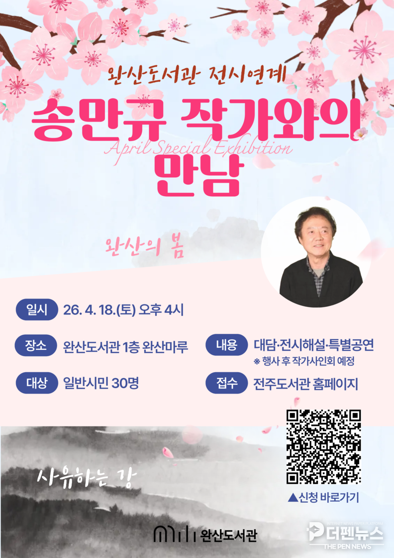 전주시는 완산도서관에서 ‘강의 화가’로 알려진 송만규 작가와 함께하는 ‘작가와의 만남’ 행사를 개최한다고 밝혔다. 이번 프로그램은 도서관 기획전시와 연계해 작가의 예술 세계를 보다 깊이 있게 전달하기 위해 마련됐다.