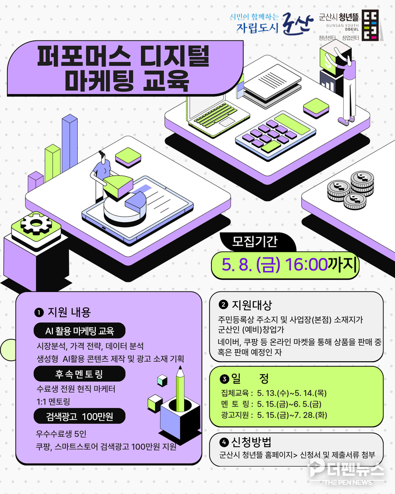 군산시 청년뜰 창업센터는 4월 20일부터 5월 8일까지 ‘2026년 퍼포먼스 디지털 마케팅 교육’ 참여자를 모집한다고 밝혔다.
