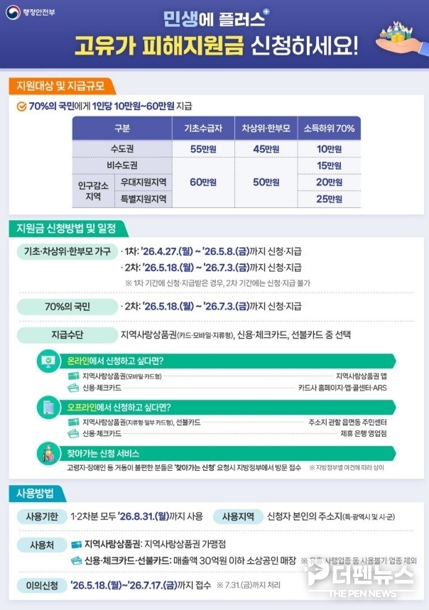 지원금은 신용·체크카드 충전이나 지역사랑상품권, 선불카드 형태로 받을 수 있다. 사용은 지역 내 연 매출 30억 원 이하 소상공인 업소 등에서 가능하며, 사용 기한은 8월 31일까지다. 기한 내 사용하지 않은 금액은 소멸된다.