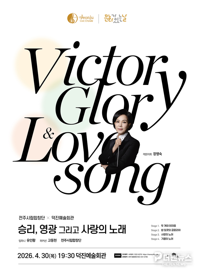 전주시립합창단은 오는 30일 덕진예술회관에서 ‘승리, 영광 그리고 사랑의 노래’를 주제로 기획 공연을 선보인다.