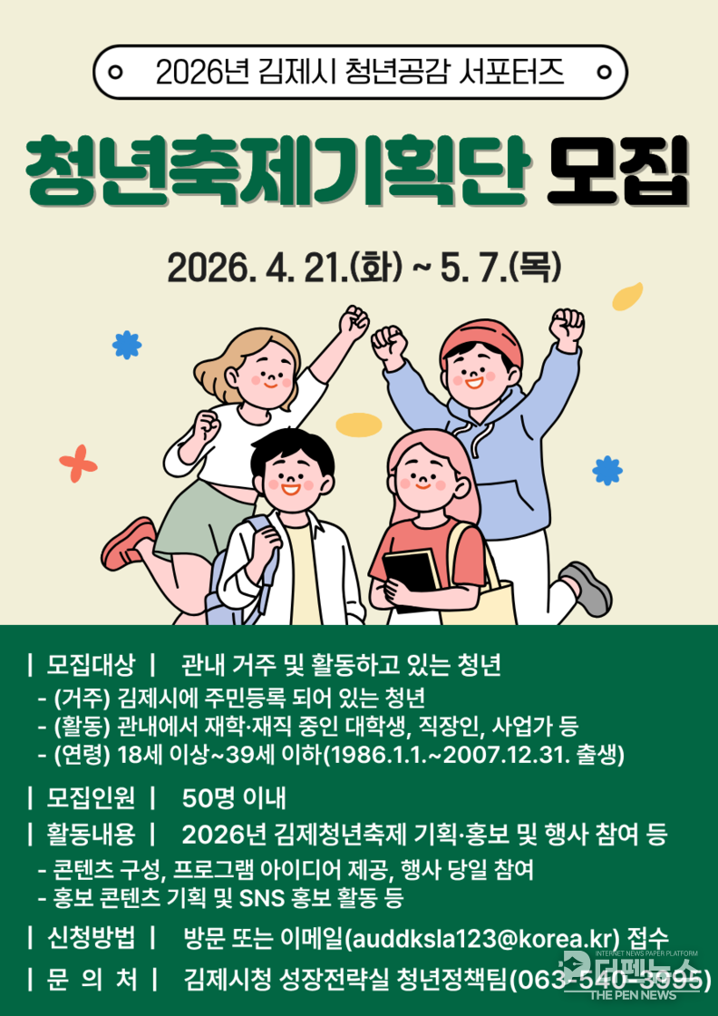 김제가 청년이 직접 축제를 설계하고 운영하는 ‘청년축제기획단(청년공감 서포터즈)’을 모집한다. 기존의 정책 제안 중심 서포터즈 운영 방식에서 벗어나, 기획부터 실행까지 전 과정을 청년에게 맡기는 것이 핵심이다.