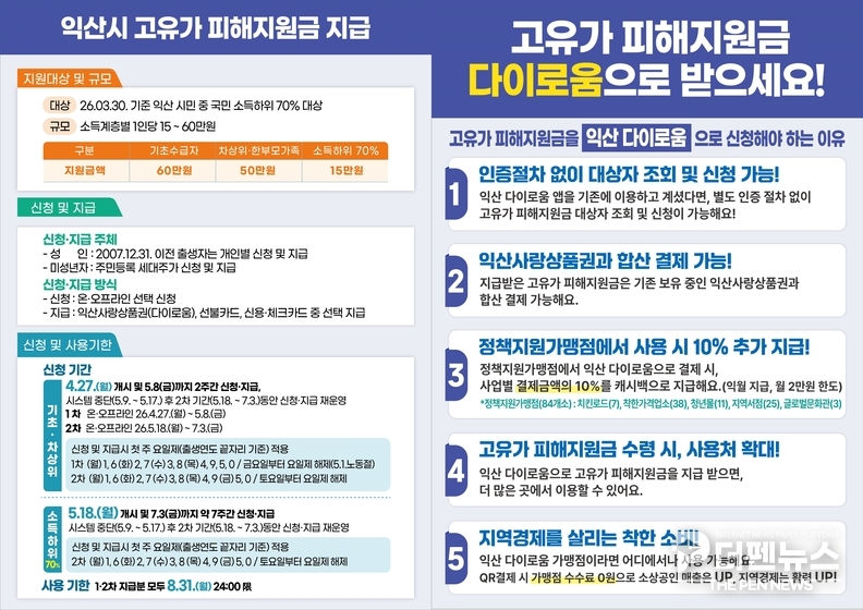익산시는 고유가 피해지원금을 지역사랑상품권 ‘다이로움’을 통해 지급하고, 이를 활용한 소비 촉진에 나섰다. 시민 편의성과 소상공인 매출 확대를 동시에 고려한 구조다.
