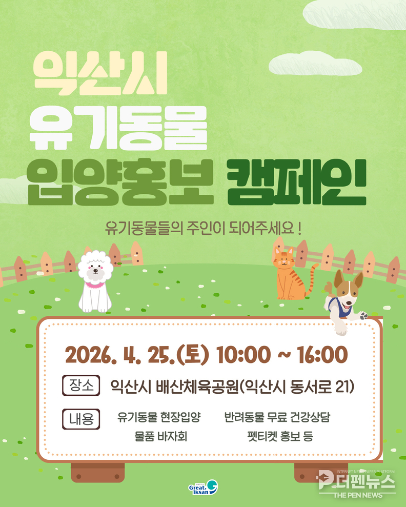익산시는 오는 25일 배산체육공원에서 유기동물 입양·홍보 캠페인을 열고 시민 참여를 유도한다. 생명 존중 인식 확산과 책임 있는 반려문화 정착을 목표로 한 현장형 행사다.