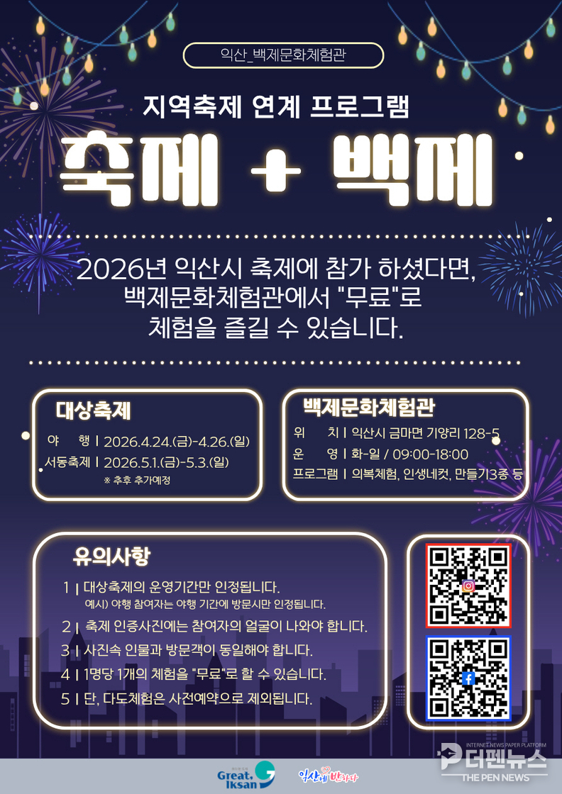 이번 이벤트는 ‘익산백제 국가유산 야행’과 ‘서동축제’ 기간에 맞춰 진행된다. 축제 현장을 방문한 뒤 인증 사진을 제시하면 백제문화체험관에서 체험 프로그램을 무료로 이용할 수 있는 방식이다.