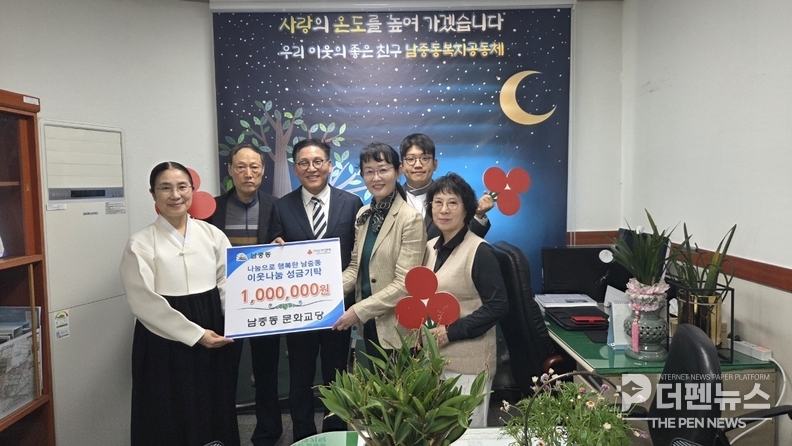 남중동에 위치한 원불교 문화교당은 행정복지센터를 찾아 성금 100만 원을 기탁했다. 이번 성금은 지역사회보장협의체를 통해 저소득 가정과 취약계층 지원에 사용될 예정이다.