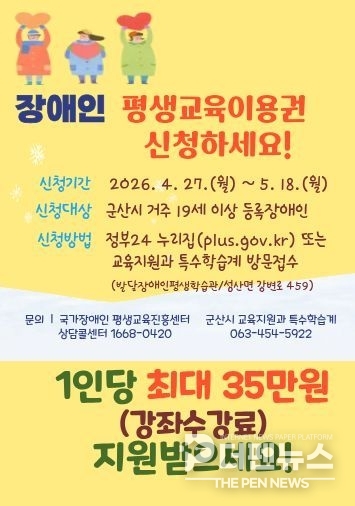 군산이 등록 장애인을 대상으로 평생교육 이용권을 지원하며 학습 기회 확대에 나섰다. 지원 대상은 19세 이상 장애인으로, 연 35만 원 상당의 바우처가 제공된다.