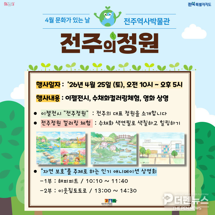 박물관은 25일 ‘전주정원’을 주제로 한 4월 문화행사를 열고, 가족 단위 방문객이 함께 즐길 수 있는 다양한 체험 프로그램을 운영했다. 이번 행사는 봄의 절정을 알리는 시기에 맞춰 자연과 정원문화를 쉽고 친근하게 접할 수 있도록 기획됐다.