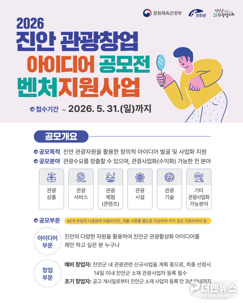(사)진안군관광협의회는 관광자원을 기반으로 한 창의적 비즈니스 모델을 발굴하기 위해 ‘2026 진안 관광창업 아이디어 공모전’을 개최하고 오는 5월 31일까지 참가 신청을 받는다고 밝혔다.