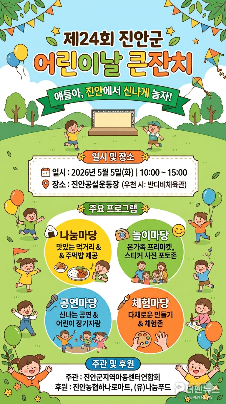 진안군지역아동센터연합회는 제24회 어린이날을 맞아 오는 5월 5일 오전 10시부터 진안공설운동장 일원에서 ‘어린이날 큰잔치’를 개최한다고 밝혔다. 우천 시에는 반다비체육관으로 장소를 옮겨 진행된다.