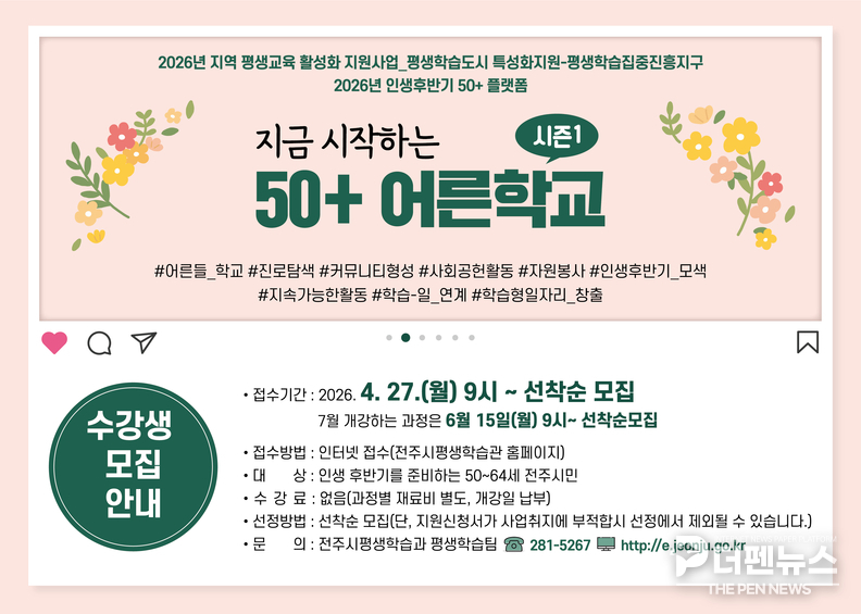 전주시는 50~64세 시민을 대상으로 한 맞춤형 평생학습 프로그램 ‘50+ 어른학교’ 수강생을 모집한다고 28일 밝혔다. 이번 과정은 교육부 공모사업인 ‘지역 평생교육 활성화 지원사업’의 일환으로 운영된다.