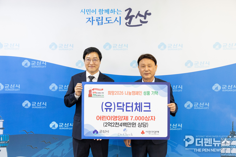 군산시는 건강기능식품 기업 (유)닥터체크가 어린이 영양제 7,000박스(약 2억2천4백만 원 상당)를 기탁했다고 27일 밝혔다. 기탁 물품은 지역아동센터 46개소와 드림스타트 대상 아동들에게 전달될 예정이다.