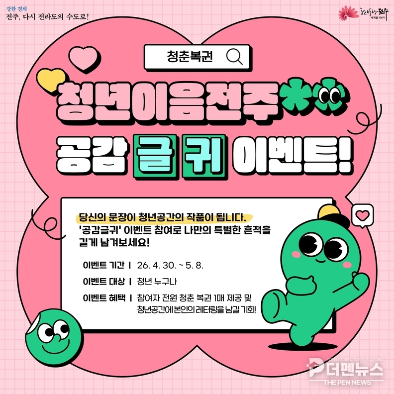 전주시는 청년센터 ‘청년이음전주’에서 청년 참여형 공감 문구 이벤트를 추진한다고 29일 밝혔다.