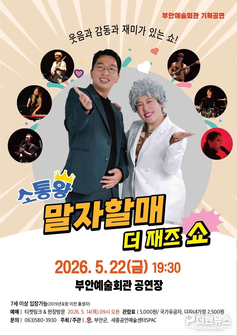 부안군은 오는 5월 22일 부안예술회관에서 기획공연 ‘소통왕 말자할매 더 재즈 SHOW’를 선보인다고 밝혔다.