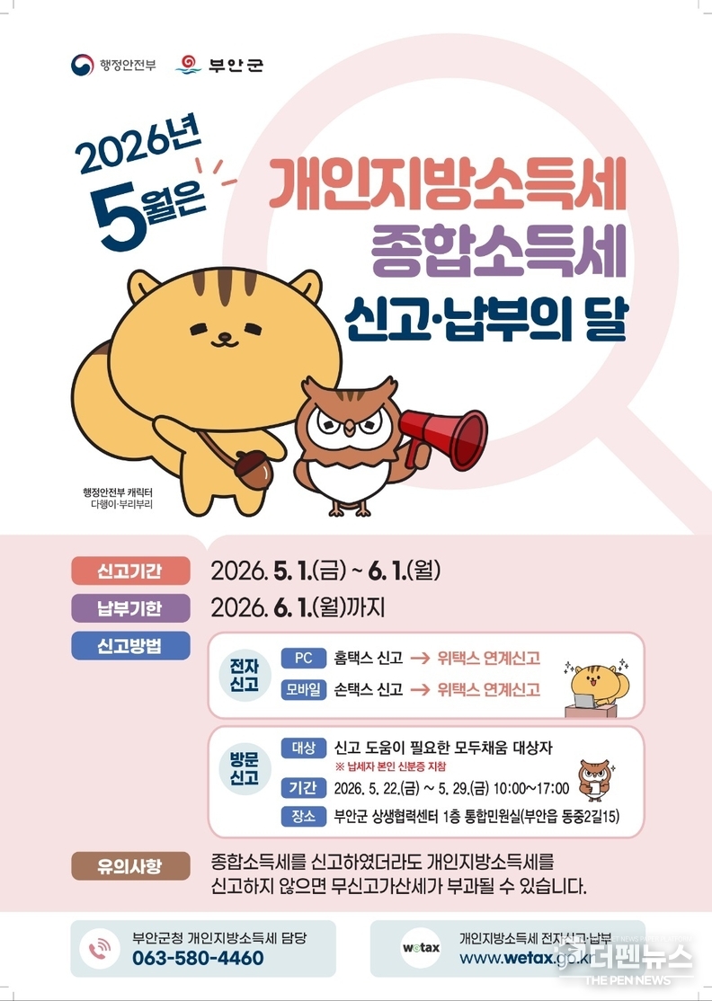 부안군은 5월 1일부터 6월 1일까지 2025년 귀속 개인지방소득세 신고·납부 기간을 운영한다고 밝혔다.